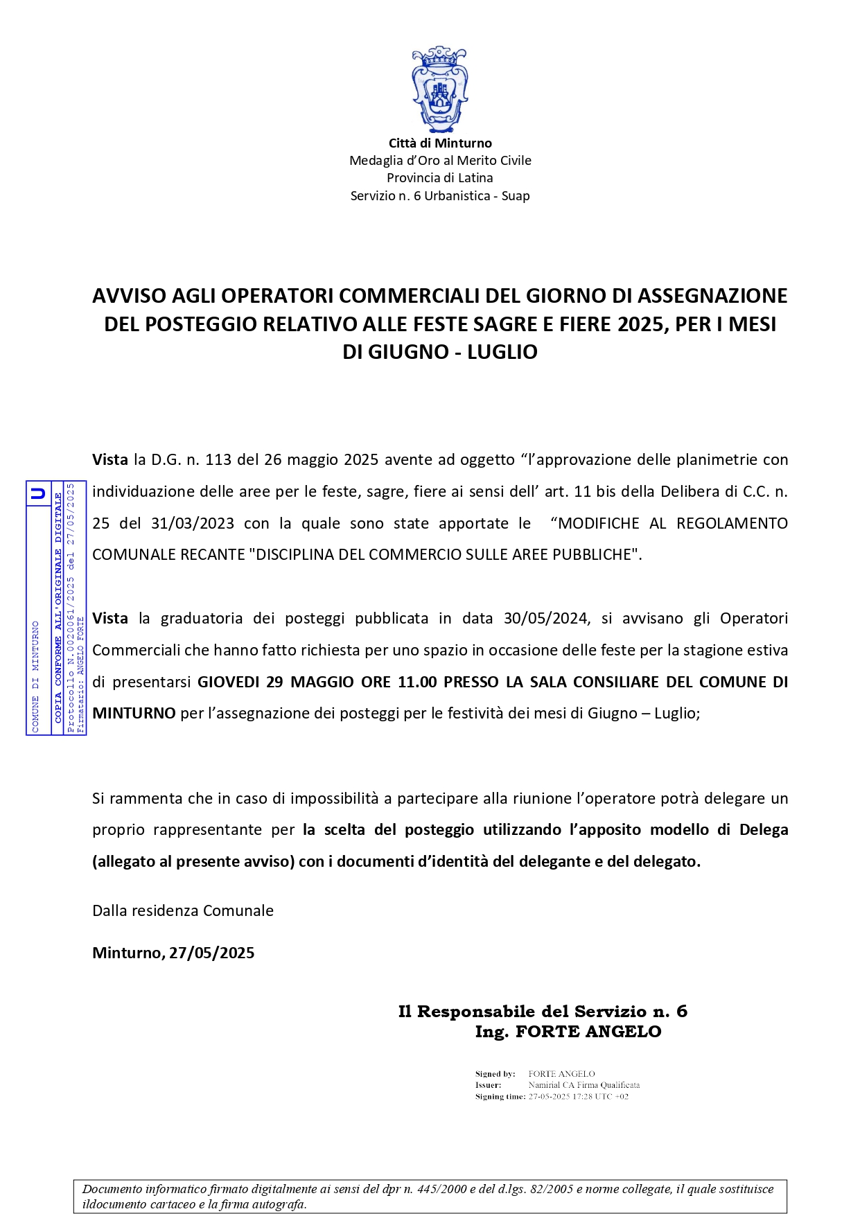 giovedì 29 maggio 2025, alle ore 11, presso la Sala Consiliare del Comune di Minturno