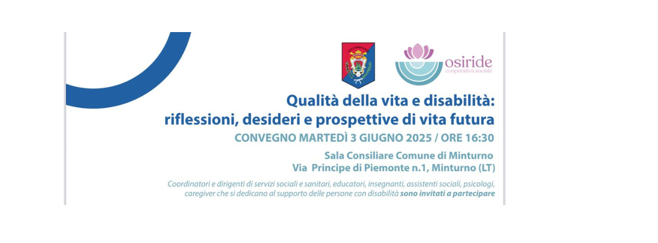 Si svolgerà martedì 3 giugno, ore 16.30, alla Sala Consiliare del Comune di Minturno, il convegno “Qualità della vita e disabilità: riflessioni, desideri e prospettive di vita futura”, promosso dalla Cooperativa Sociale Osiride con il patrocinio del Comune di Minturno.