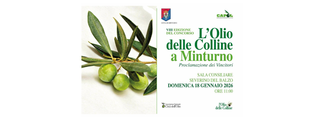 Si terrà domenica 18 gennaio, alle ore 11:00, presso la Sala Consiliare, la Proclamazione dei vincitori dell'8a edizione del concorso “L'olio delle colline a Minturno” promosso dall'Associazione CAPOL con il patrocinio del Comune di Minturno.